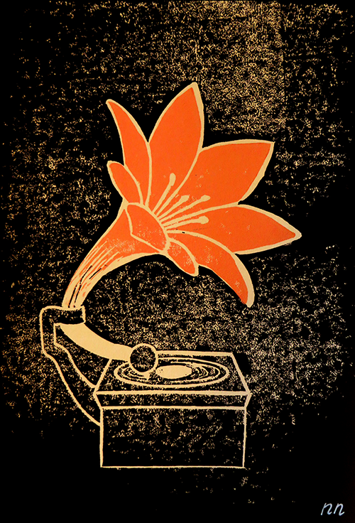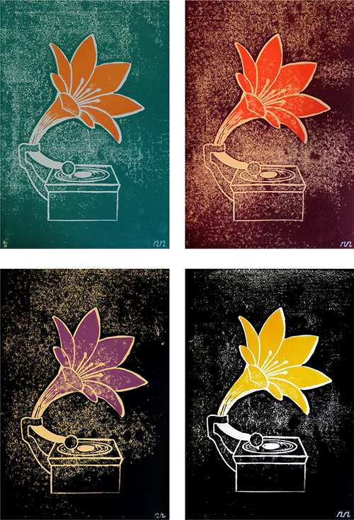 Home-made linoprint op A4-formaat (21 x 29,7 cm) in oplage van 21 in diverse kleurencombinaties.